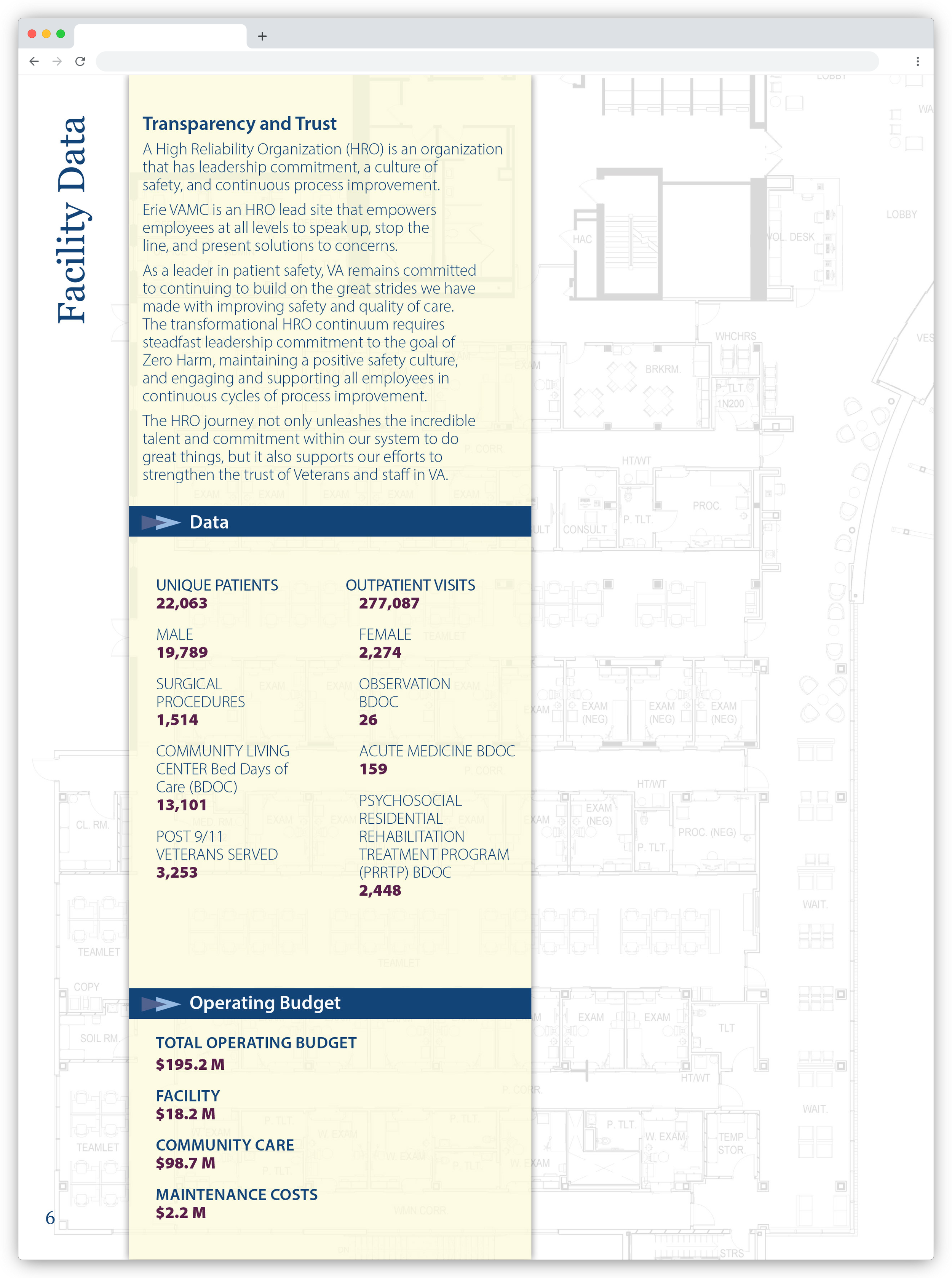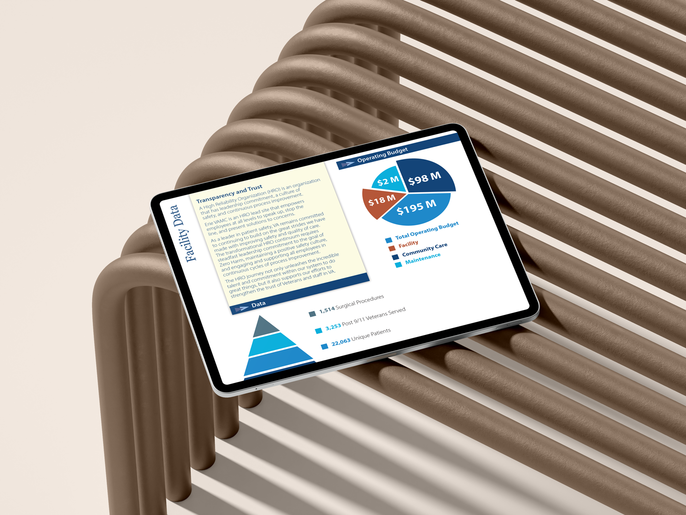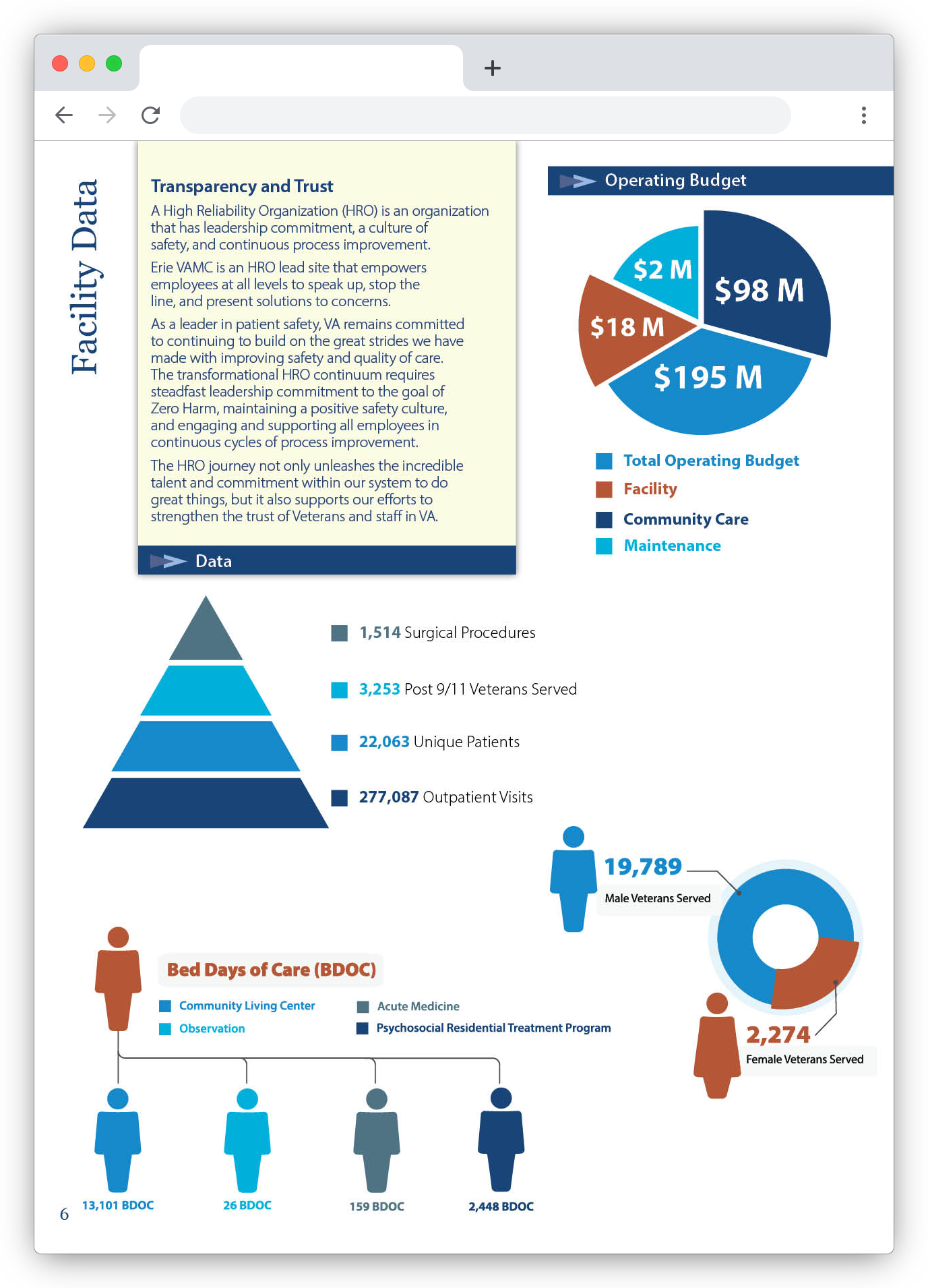 The FY24 Annual Report for the Erie VA Medical Center required a design system that could translate extensive departmental data into clear, engaging visuals. My focus was on transforming complex statistics, charts, and narratives into an accessible visual experience that clearly highlighted the organization’s yearly achievements.